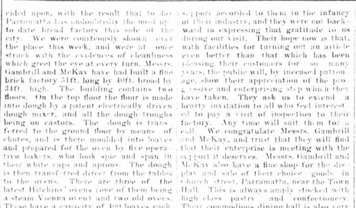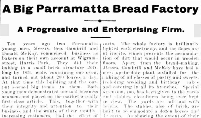 Ten years ago two Parramatta young men, Messrs. Geo. Gambrill and Donald McKay, commenced business as bakers on their own account at Wigram street, Harris Park. They did their baking in a small brick structure 20ft. long by 18ft. wide, containing one oven, and turned out about 200 loaves a day.