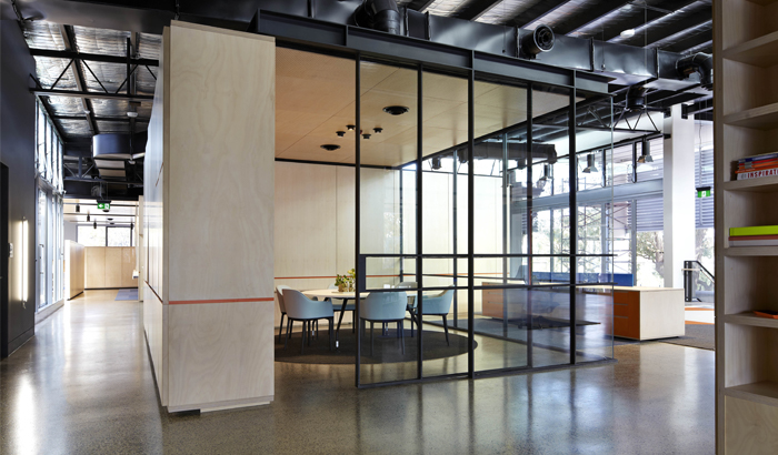 Kennards Self Storage is in the business of boxes, warehouses and storage areas. The brief was to design a new work environment that encourages increased staff interaction and that says something about the nature of the business. The meeting rooms were designed as plywood boxes and the circulation became part of the leftover space surrounding the structures. With this simple design premise for the large elements, SJB Interiors introduced elegance with refined details on a small scale with joinery, steelwork and materiality. The Kennards team was intent on the outcome having a wonderful sense of design but not being over-designed. This influenced SJB Interiors’ design premise in many ways: a restrained budget, selection of simple materials and paring back the design to only what is necessary.